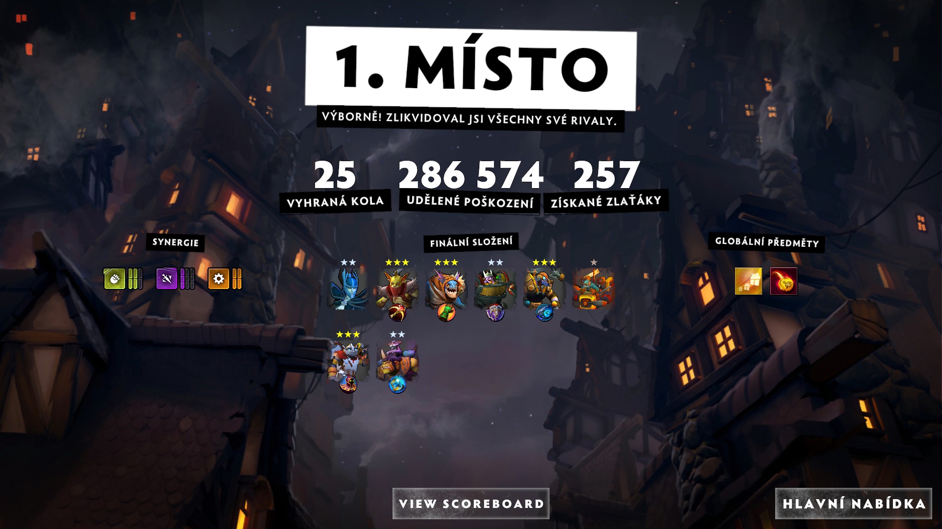 Ještě dovětek - i když jsem to viděl na výhru, tak se hodně často stalo, že jsem vyletěl cca na 5 místě. Možná za to mohlo, že hra vás nutí kupovat karty přesně v konkrétní moment a ne dřív, takže pořád vám plyne úrok ze zlaťáků že nikdy nekoupíte nic dřív, což ale v tom presu člověk dělá chyby :-) a sem tam se o 2-3 zlaté připraví. Když vyhrajete, tak soupeř na druhém místě je dost drsný, takže i špičková kombinace synergií s plnou dvojkovou sestavou a jednou trojkou, dobře vybranými předměty a správně rozmístěnými na postavách nemusí znamenat nutně vítězství proti právě jeho sestavě. Je prostě třeba si tipnout ke konci když je už jen 4-5 hráčů ve hře, kdo to bude, a podívat se kde má rozmístěnou svojí bandu a jestli vám lítá na zadek, a pak v té poslední hře si dát třeba svoje do rohu a kolem nich ty správné tanky, prostě vše musí být perfektní aby klapla výhra.. Čili vyhrát ranked je těžké, ale i při prohrách jsem měl dojem, že mne ta daná kombinace bavila. Taky mne bavilo dát štít předvoje na IO (orb) který je zcela vzadu. Takže je z něj tuhý zadné obránce.
